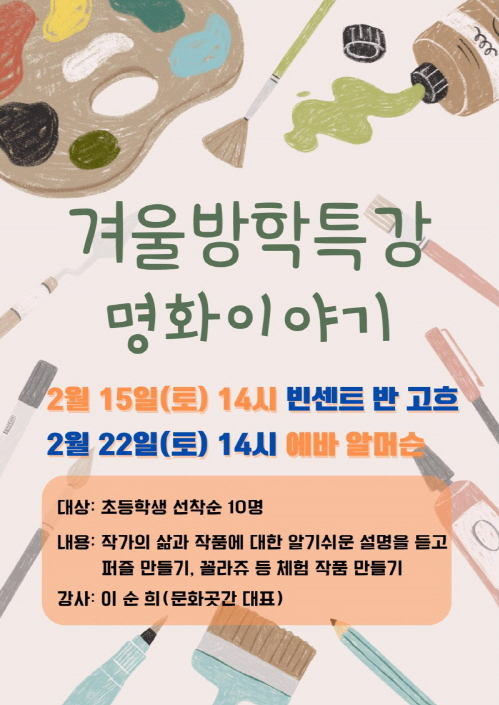 | 10 | 봉화정자문화생활관 「겨울방학 특집 명화이야기」 프로그램 안내 | 체육시설사업소 | 2025.02.07 | ![]() |