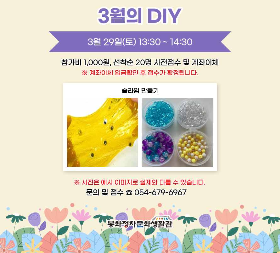 | 11 | 봉화정자문화생활관 3월 29일 DIY 행사 [나만의 슬라임 만들기] | 체육시설사업소 | 2025.03.18 | ![]() |
