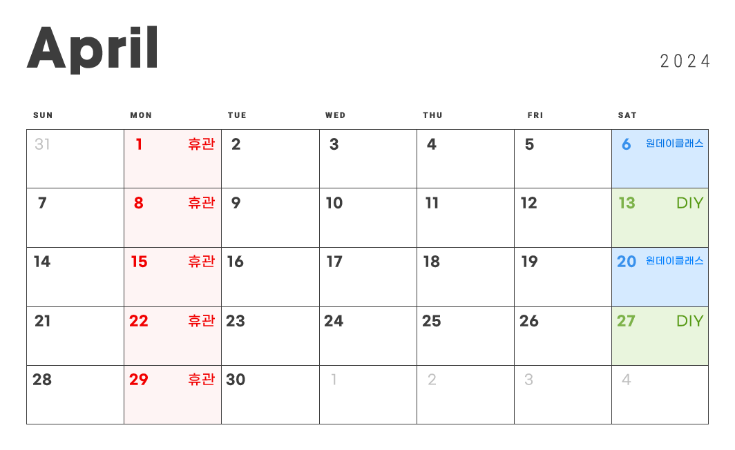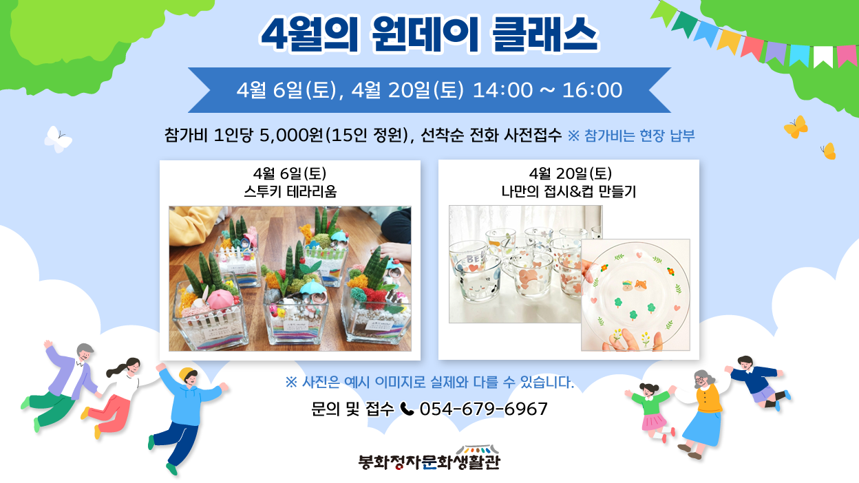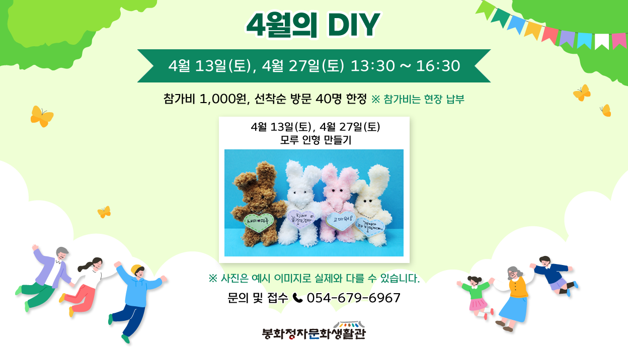 | 1 | 봉화정자문화생활관 4월의 누정 휴(休) 공간 만들기(4월 원데이클래스 접수 마감) 4월 DIY 4/13(토), 4/27(토) 현장접수 가능합니다. | 체육시설사업소 | 2024.03.19 | ![]() ![]() ![]() |