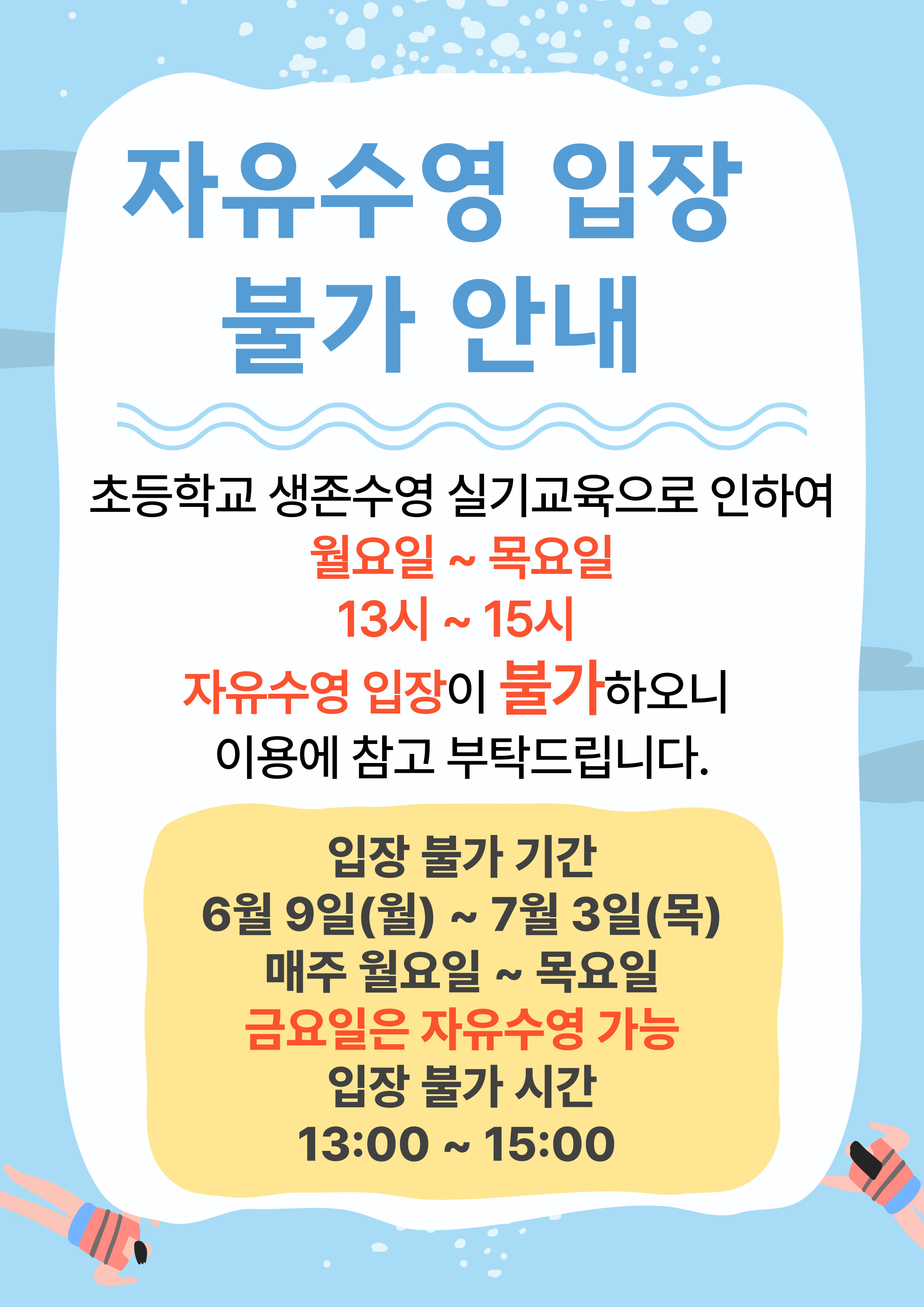 | 97 | 봉화국민체육센터 수영장 평일 오후 자유수영 입장 제한 안내 | 체육시설사업소 | 2025.05.22 | ![]() |