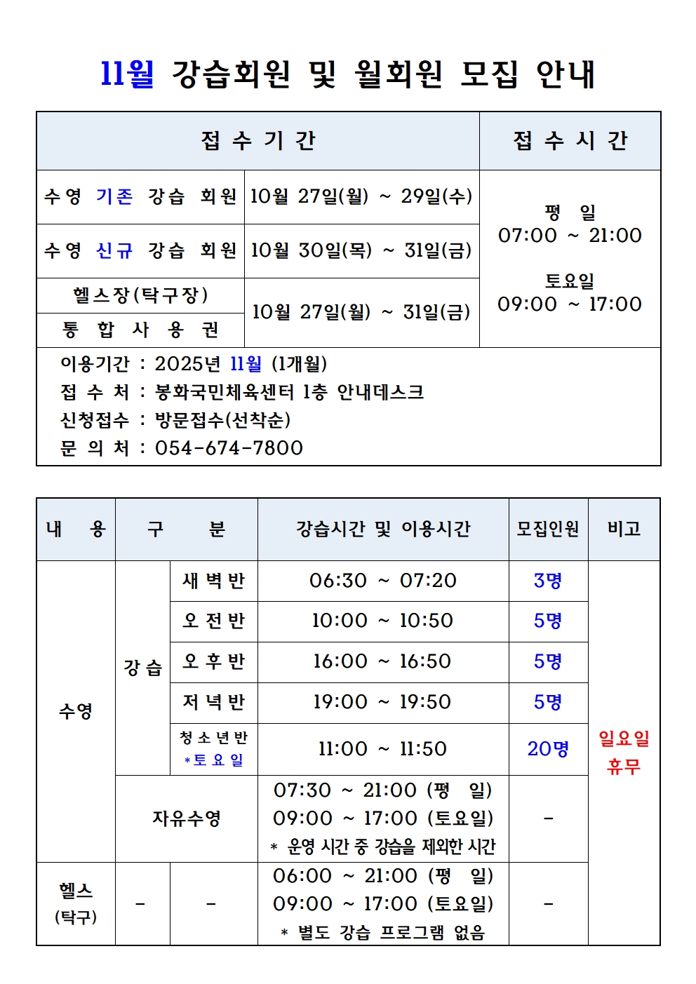 ![]() | 봉화국민체육센터 2025년 11월 강습회원 및 월회원 모집 안내 | 체육시설사업소 | 2025.05.19 | ![]() |