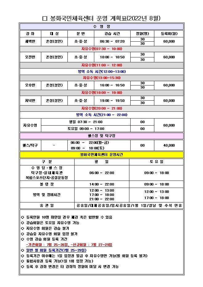 국민체육센터 강습회원 및 월회원 운영 시간 안내