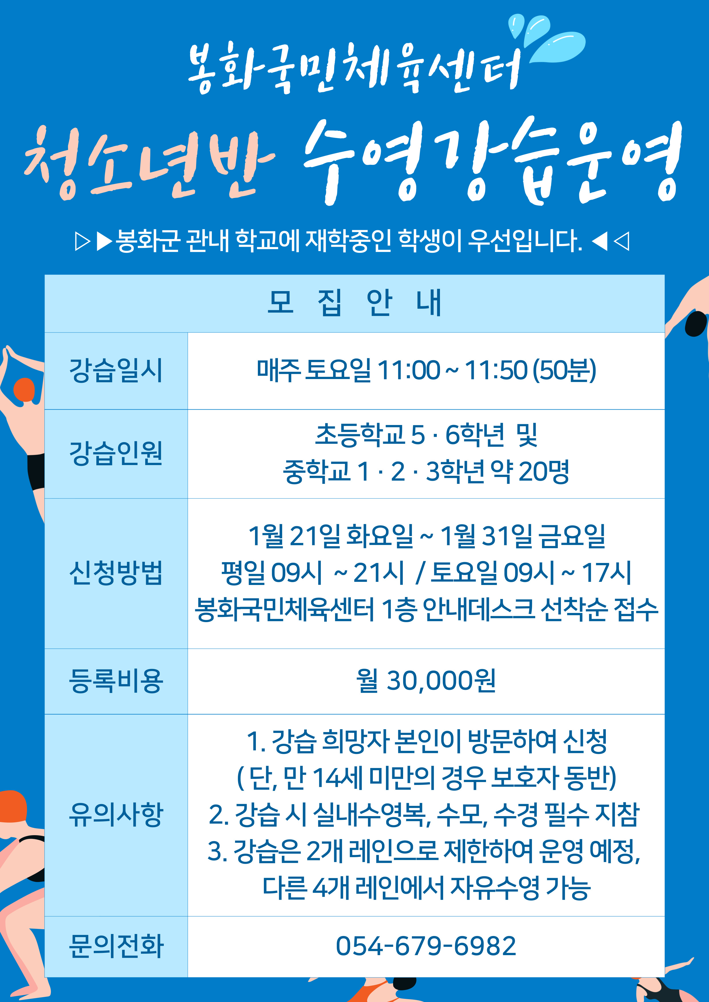봉화국민체육센터 청소년반 수영강습운영 안내