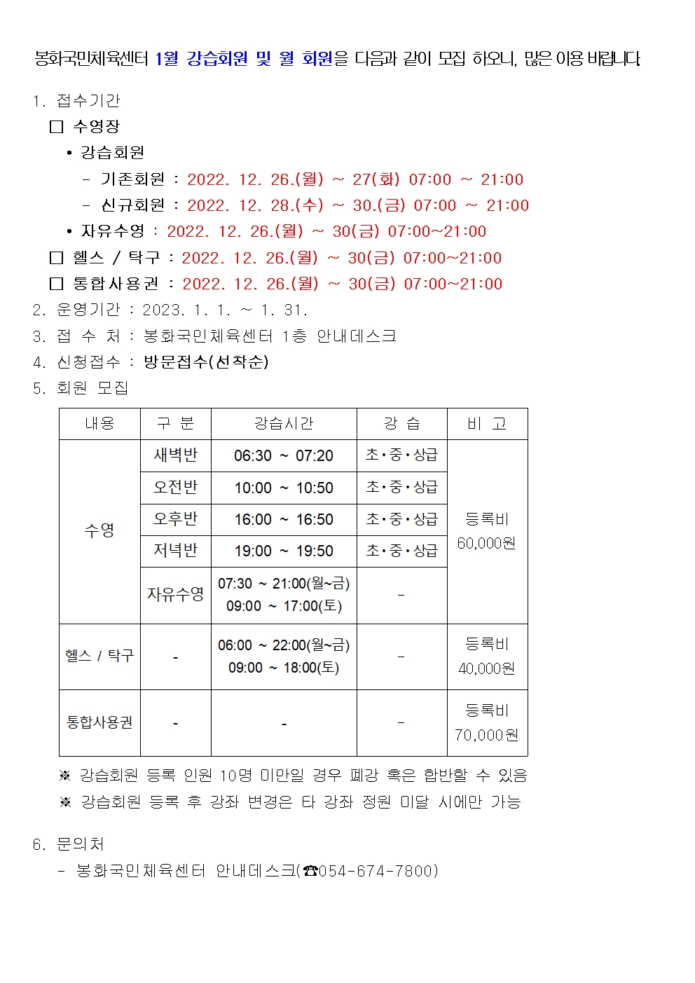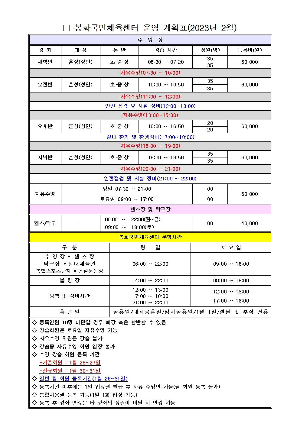 | 34 | 봉화국민체육센터 2023년 2월 강습회원 및 월 회원 등록 안내 | 김정남 | 2023.01.18 | ![]() ![]() |