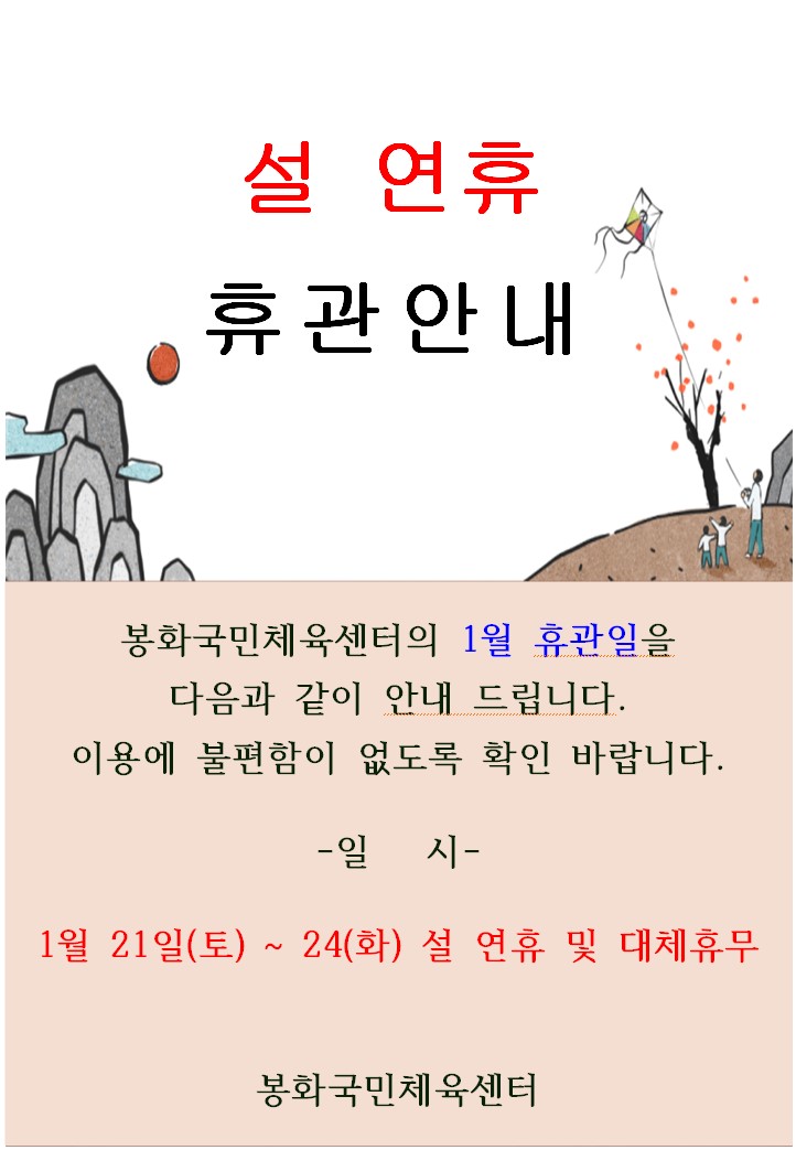 | 35 | 봉화국민체육센터 설 연휴 휴관 안내 | 김정남 | 2023.01.18 | ![]() |