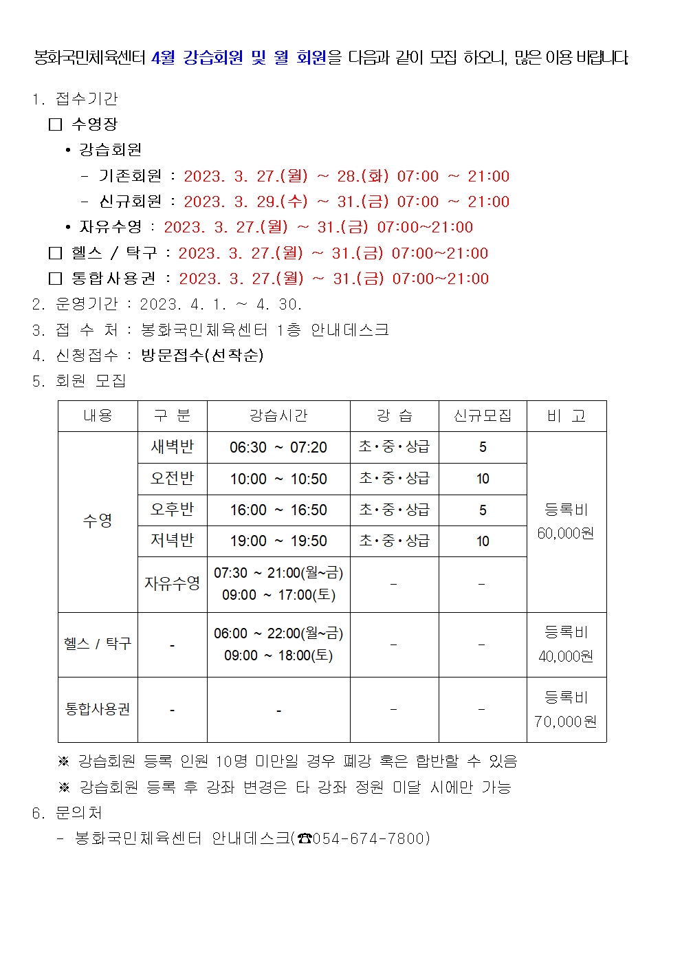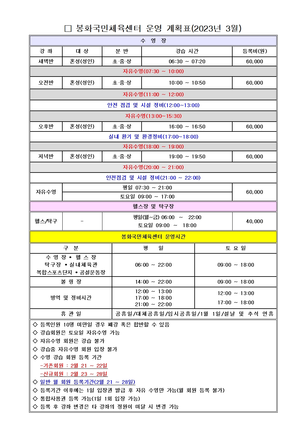 | 37 | 봉화국민체육센터 4월 강습회원 및 월회원 모집 안내 | 김정남 | 2023.03.22 | ![]() ![]() |
