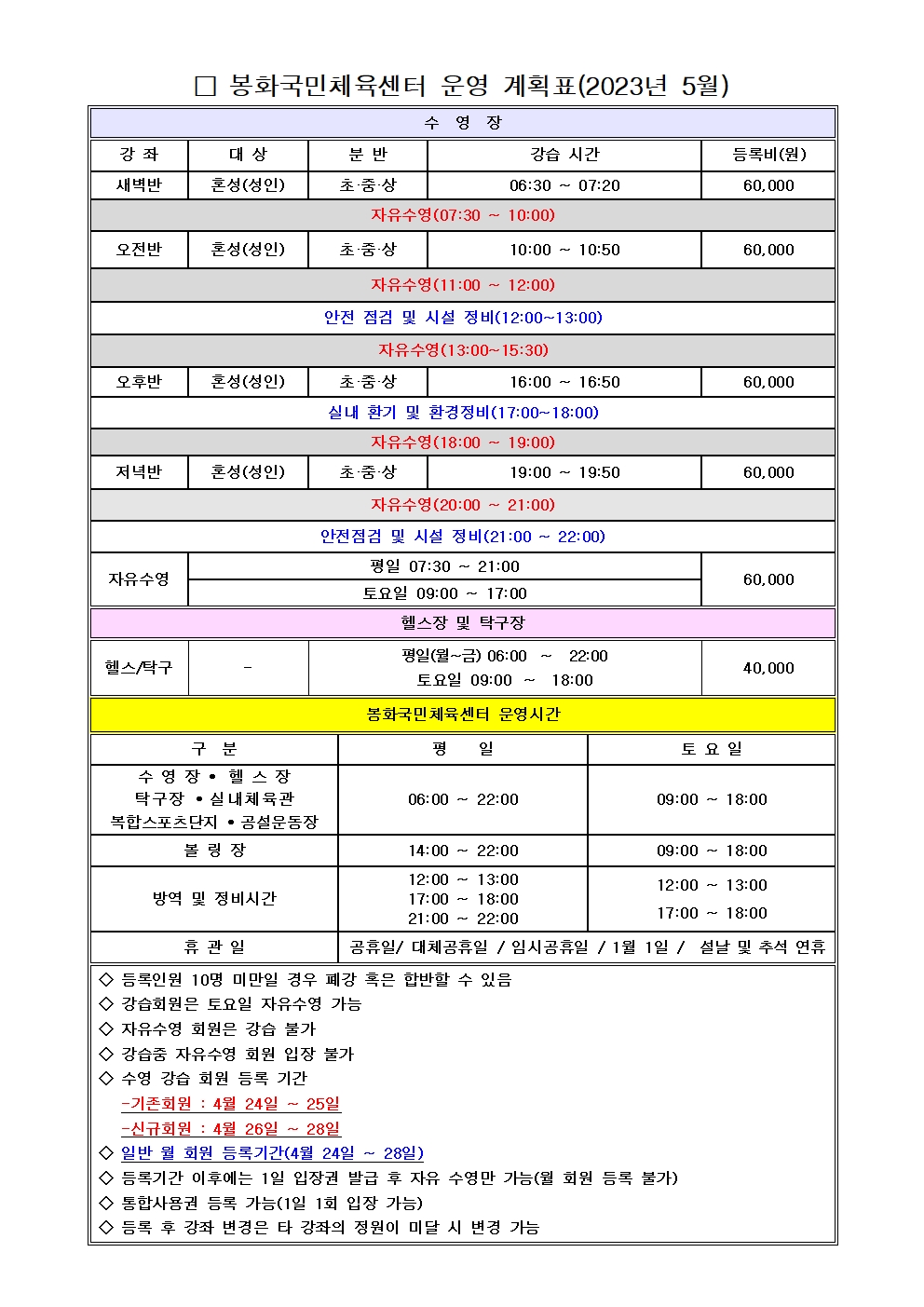 | 38 | 봉화국민체육센터 5월 강습회원 및 월 회원 모집 안내 | 김정남 | 2023.04.19 | ![]() ![]() |