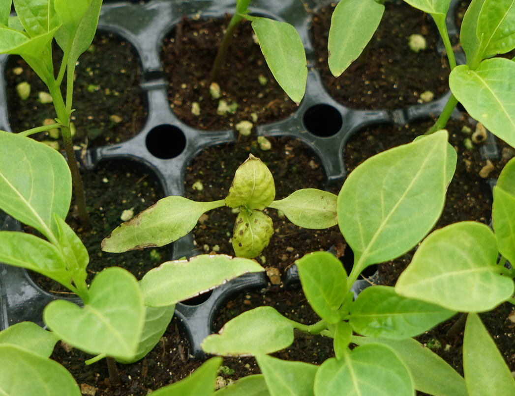 육묘 시 칼라병(토마토반점위조바이러스 TSWV)에 감염되면 나타나는 병징입니다.