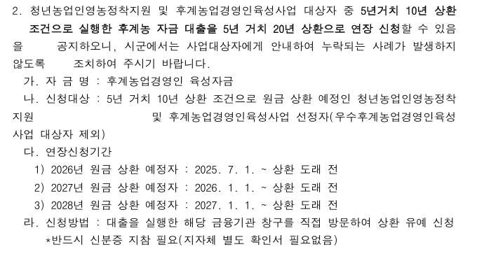 | 1266 | 후계농업경영인 육성자금 상환기간 연장 신청 안내 | 최효정 | 2025.06.16 |   | 449 |