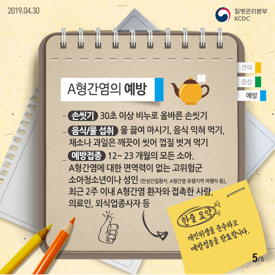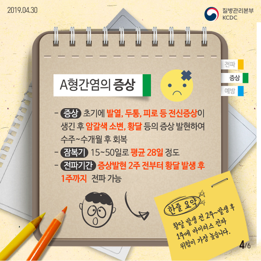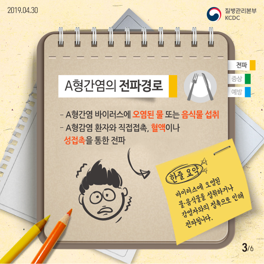 - 감염경로 : 환자와의 접촉에 따른 직접 감염 및 A형바이러스에 오염된 물이나 음식물 섭취를 통한 간접 감염