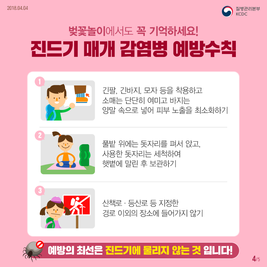 진드기 매개 감염병의 특징은 물리지 않는 것이 최고의 예방책이다.