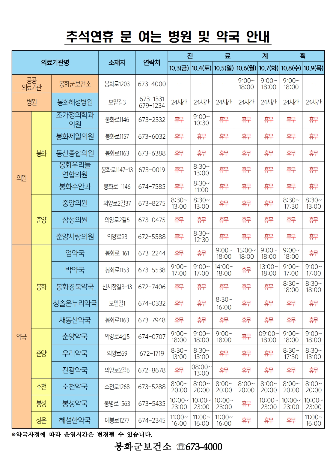 추석연휴 의료공백을 최소화하고 응급상황에 철저하게 대비하기 위하여 연휴기간 문 여는 병의원 및 약국 운영정보를 다음과 같이 안내합니다.