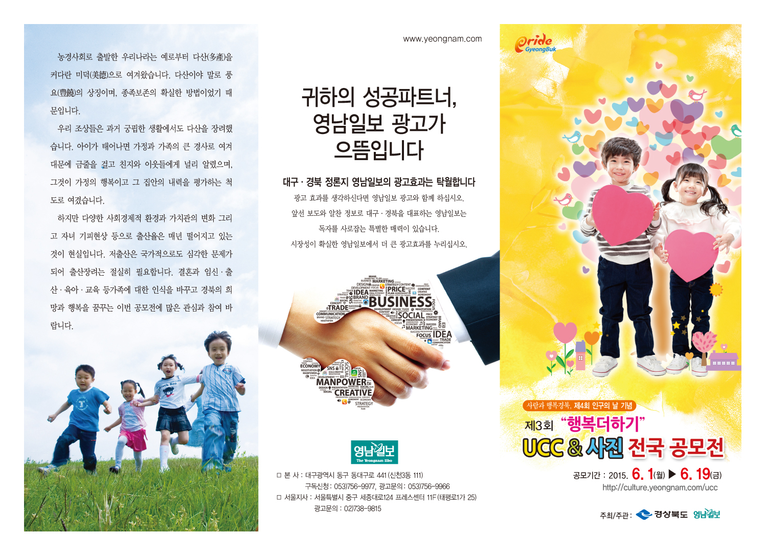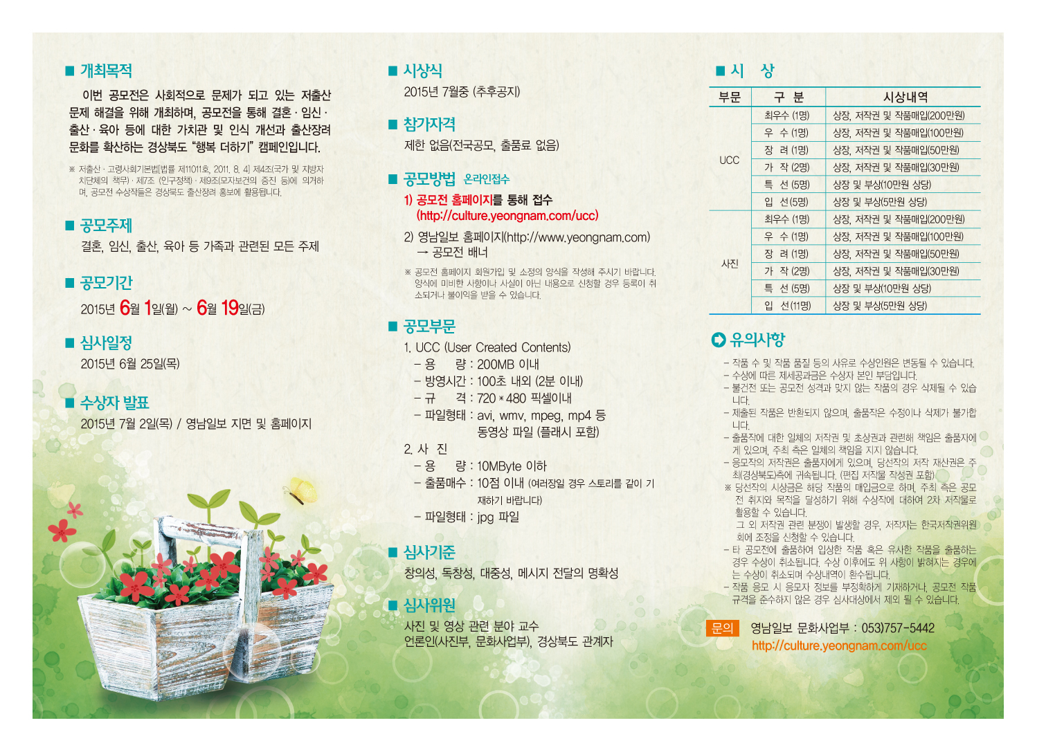 | 622 | “제3회 행복 더하기 UCC & 사진 전국공모전”안내 | 보건소 | 2015.06.02 | ![]() ![]() ![]() | 3143 |