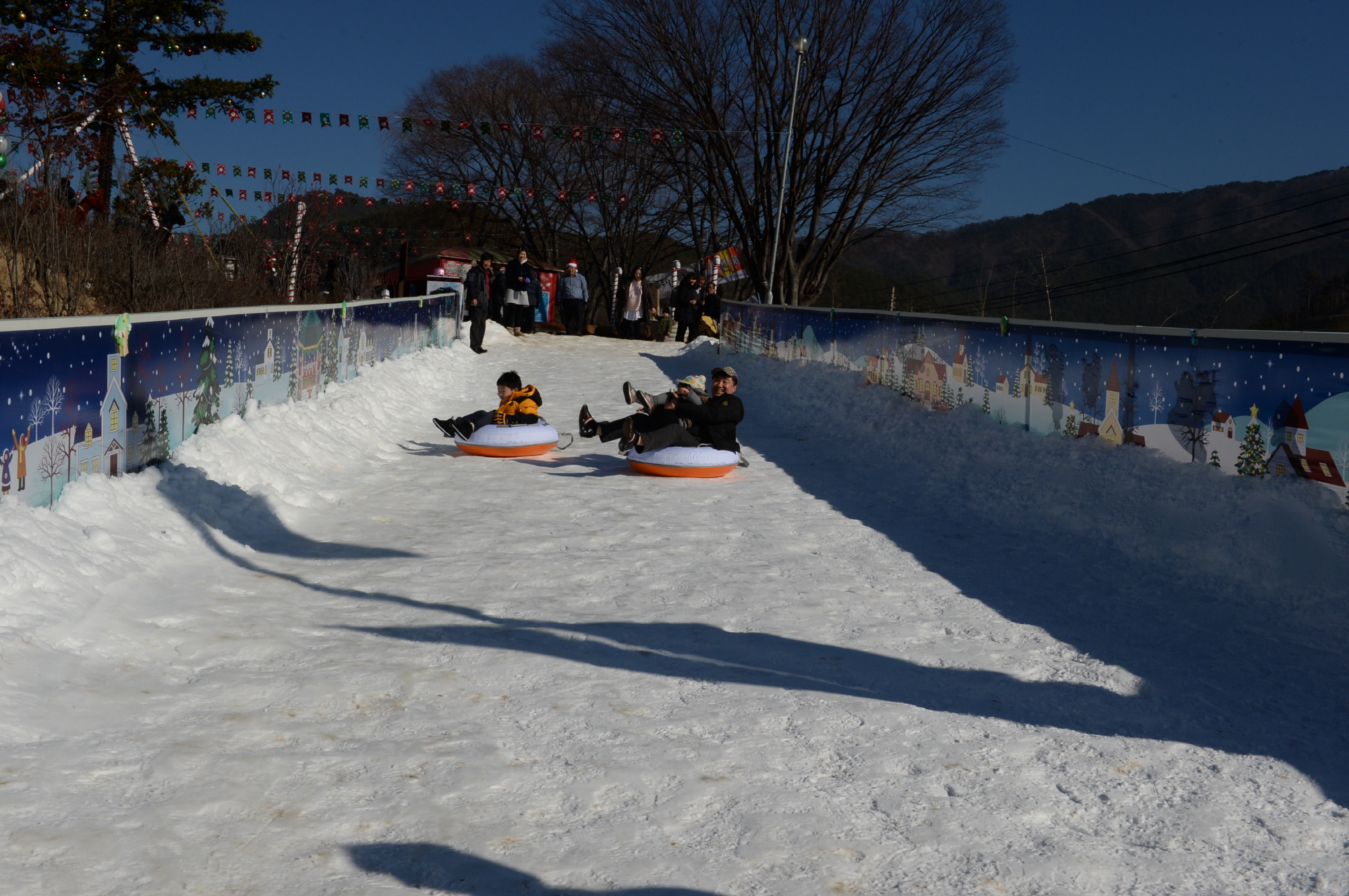 방문객들이 신나게 눈썰매를 타는 모습입니다.