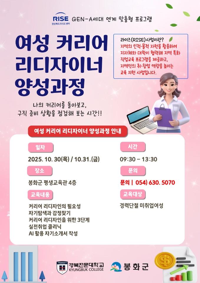 | 71 | 여성커리어 리디자이너 양성과정 수강생 모집 | 최고관리자 | 2025-10-14 | 45 | |