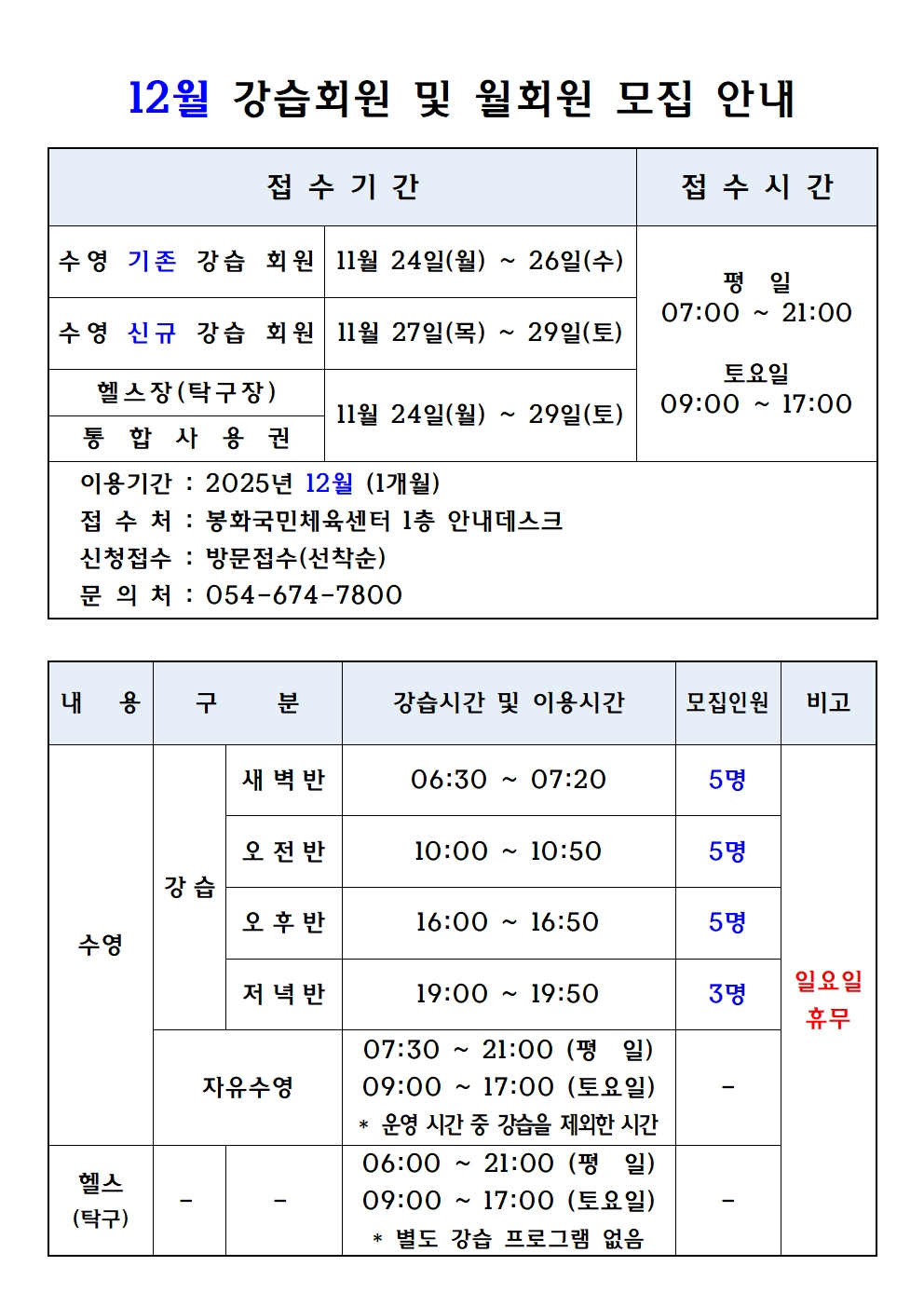 | 95 | 봉화국민체육센터 2025년 12월 강습회원 및 월회원 모집 안내 | 체육시설사업소 | 2025.05.19 | ![]() |