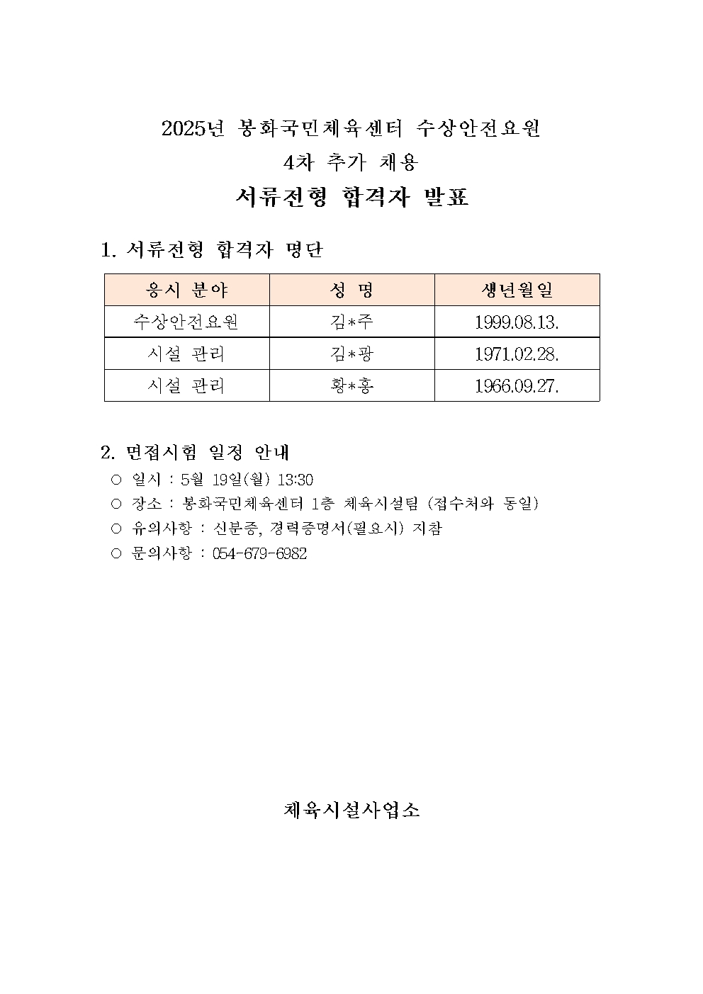 '2025년 봉화국민체육센터 수상안전요원 4차 추가 채용' 서류 전형 합격자 발표 및 면접시험 일정 안내