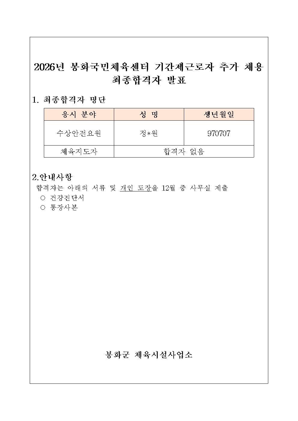 2026년도 봉화국민체육센터 기간제근로자 추가 채용 최종합격자 발표