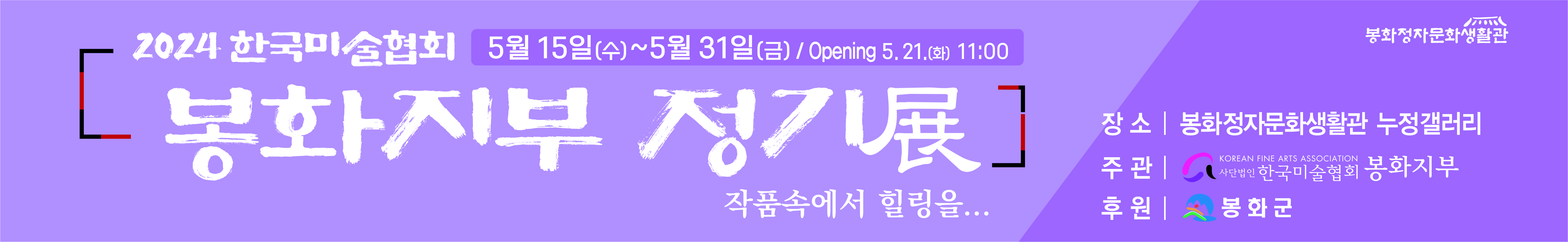 | 71 | 「2024 한국미술협회 봉화지부 정기전」 전시 개최 | 체육시설사업소 | 2024.05.16 | ![]() |