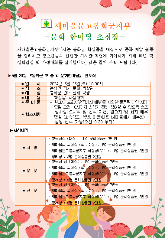 | 72 | 새마을문고 봉화군지부 문화한마당 개최 안내(2024. 5. 25) | 체육시설사업소 | 2024.05.16 | ![]() |