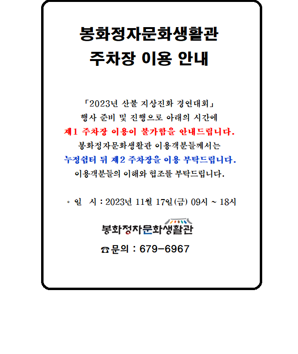 | 57 | 봉화정자문화생활관 주차장 이용 안내(11.17) | 체육시설사업소 | 2023.11.09 | ![]() |