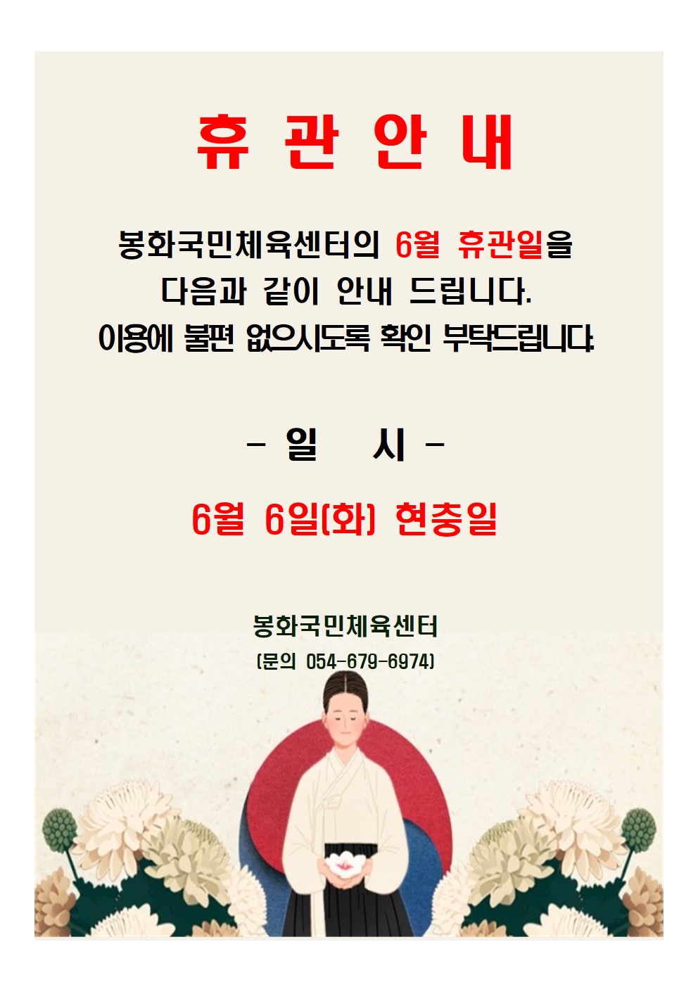 | 44 | 봉화국민체육센터 6월 현충일 휴관안내 | 김정남 | 2023.06.01 | ![]() |