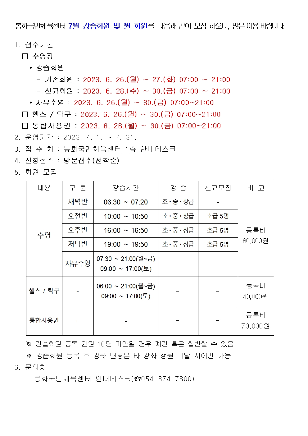| 46 | 국민체육센터 7월 강습회원 및 월 회원 모집 안내 | 김정남 | 2023.06.21 | ![]() ![]() |