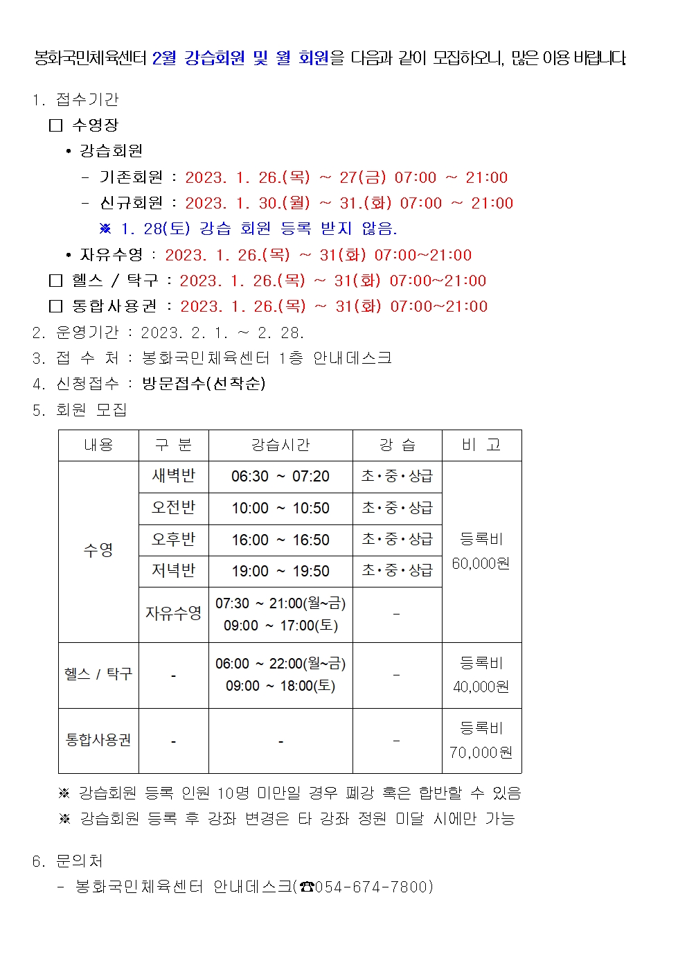 | 34 | 봉화국민체육센터 2023년 2월 강습회원 및 월 회원 등록 안내 | 김정남 | 2023.01.18 | ![]() ![]() |