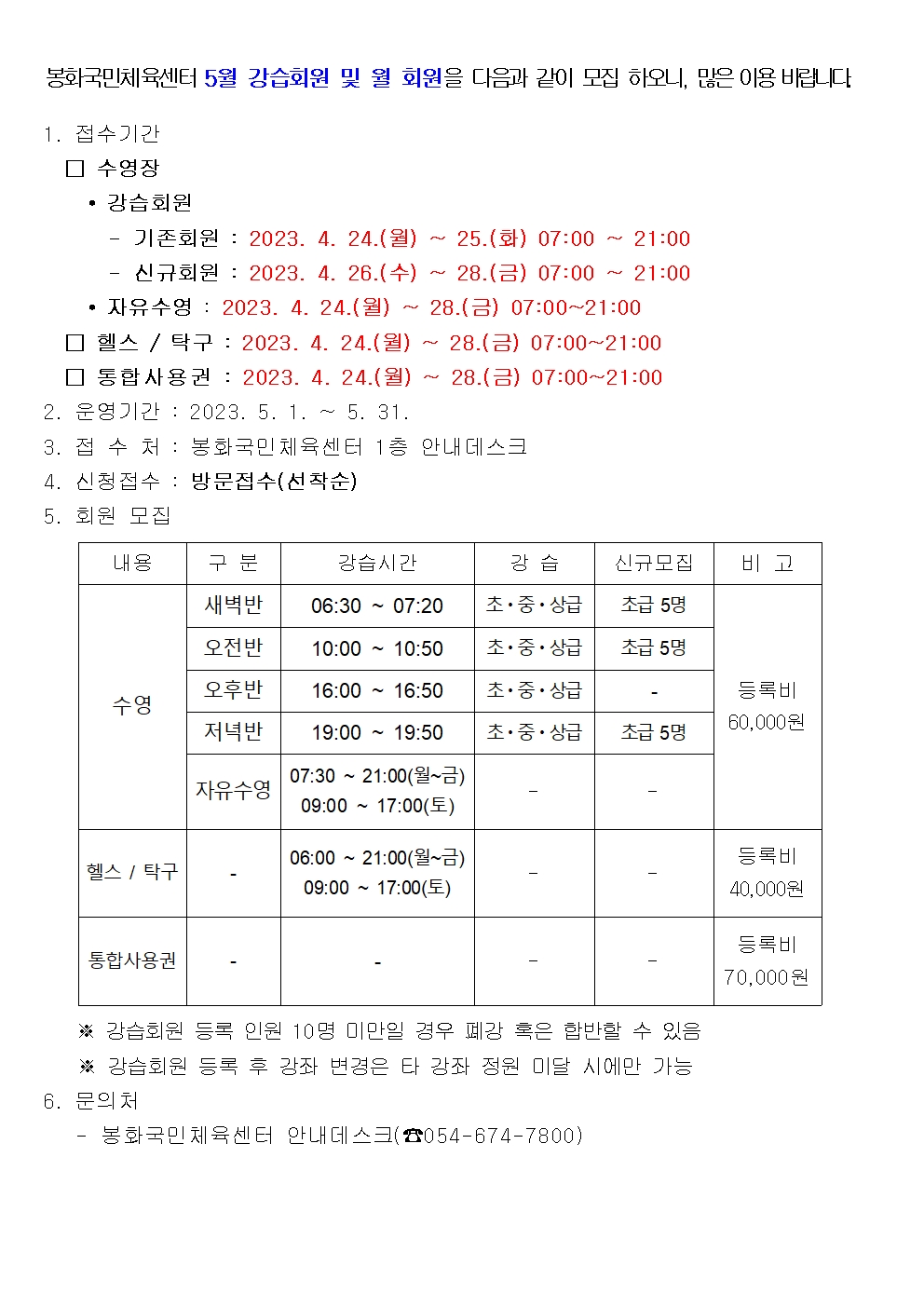 | 38 | 봉화국민체육센터 5월 강습회원 및 월 회원 모집 안내 | 김정남 | 2023.04.19 | ![]() ![]() |