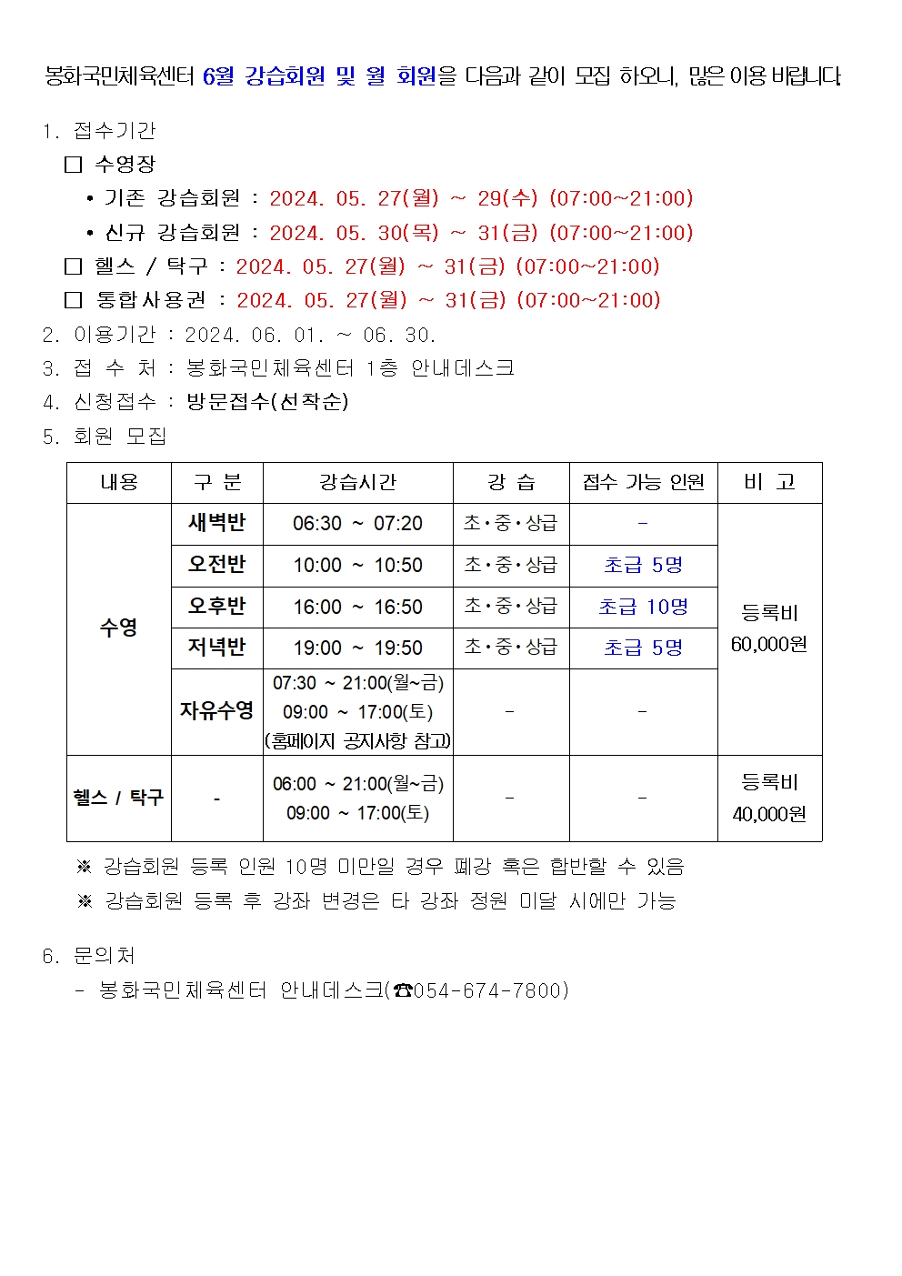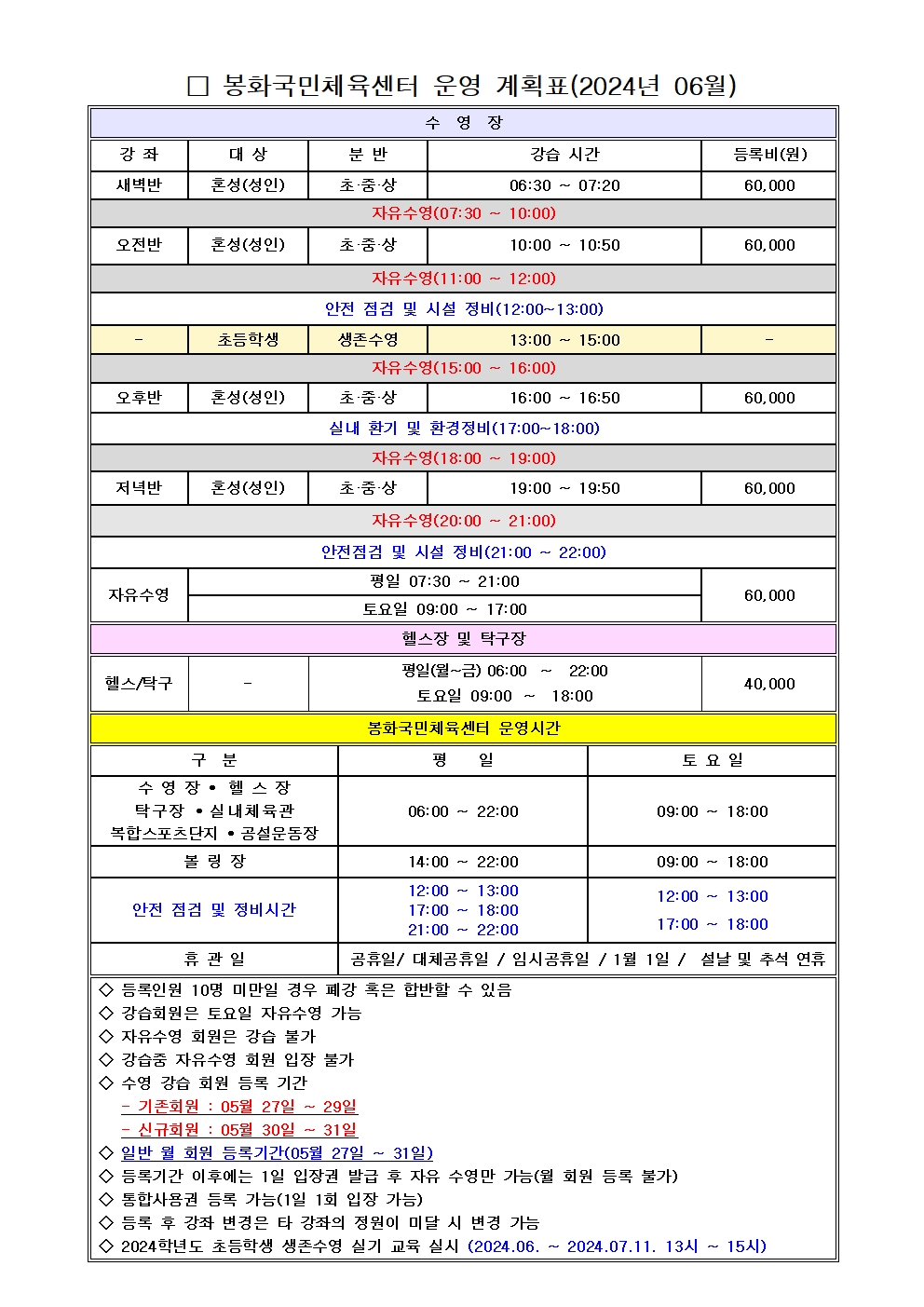 | 42 | 봉화국민체육센터 6월 강습회원 및 월 회원 모집 안내 | 김정남 | 2023.05.17 | ![]() ![]() |