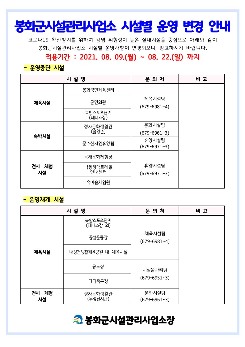 | 18 | 봉화군시설관리사업소 시설별 운영 변경 안내 | 김예리 | 2021.08.06 | ![]() |