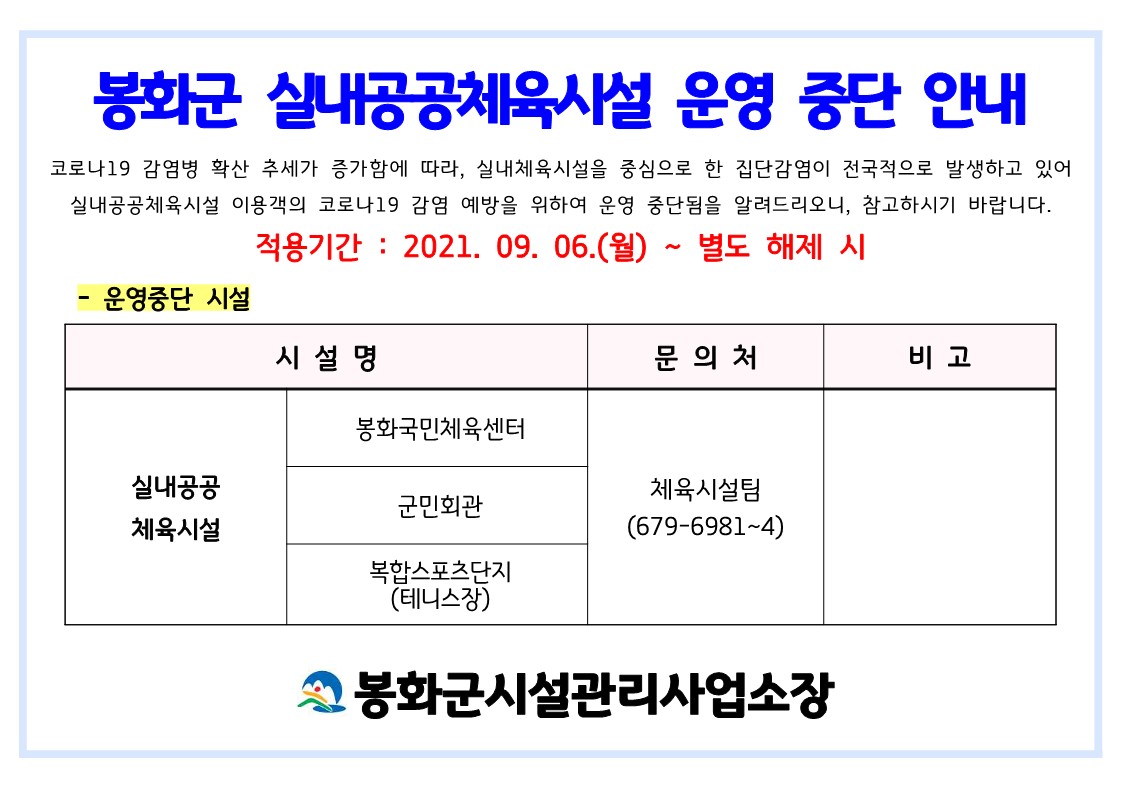 | 20 | 봉화군 실내공공체육시설 운영 중단 안내 | 김예리 | 2021.09.03 | ![]() |