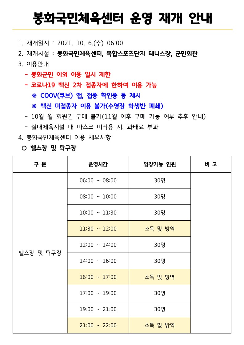 | 21 | 봉화국민체육센터 운영 재개 안내 | 김예리 | 2021.10.01 | ![]() ![]() ![]() |
