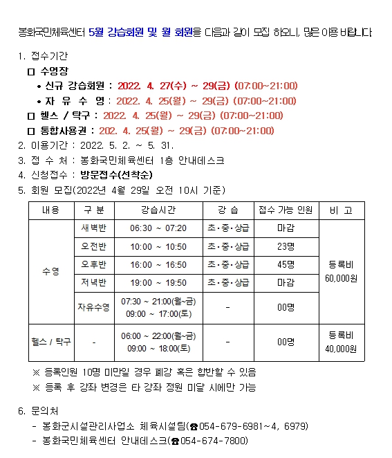 | 22 | 봉화국민체육센터 5월 수영강습 신규회원 및 월 회원 모집 안내 | 김정남 | 2022.04.18 | ![]() |