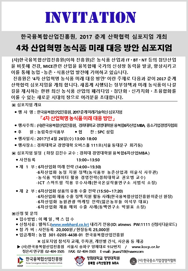 28 | [한국융복합산업진흥원] 2017 춘계 산학협력 심포지엄 개최 | 정은서 | 2017.04.14 | ![]() ![]() | 1315 |