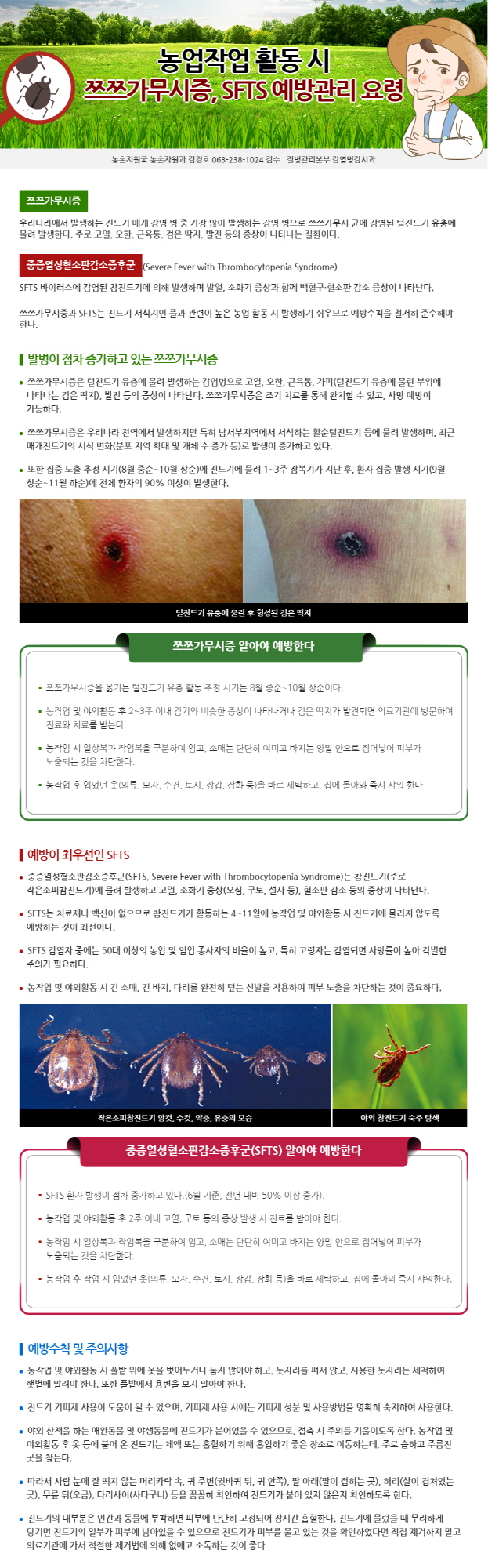 야외활동이 많은 농업인에게 발생 가능성이 높은 쯔쯔가무시증(발생시기 9~11월) 등 진드기 매개감염병 발생 사전예방을 위한 예방안내문입니다.
