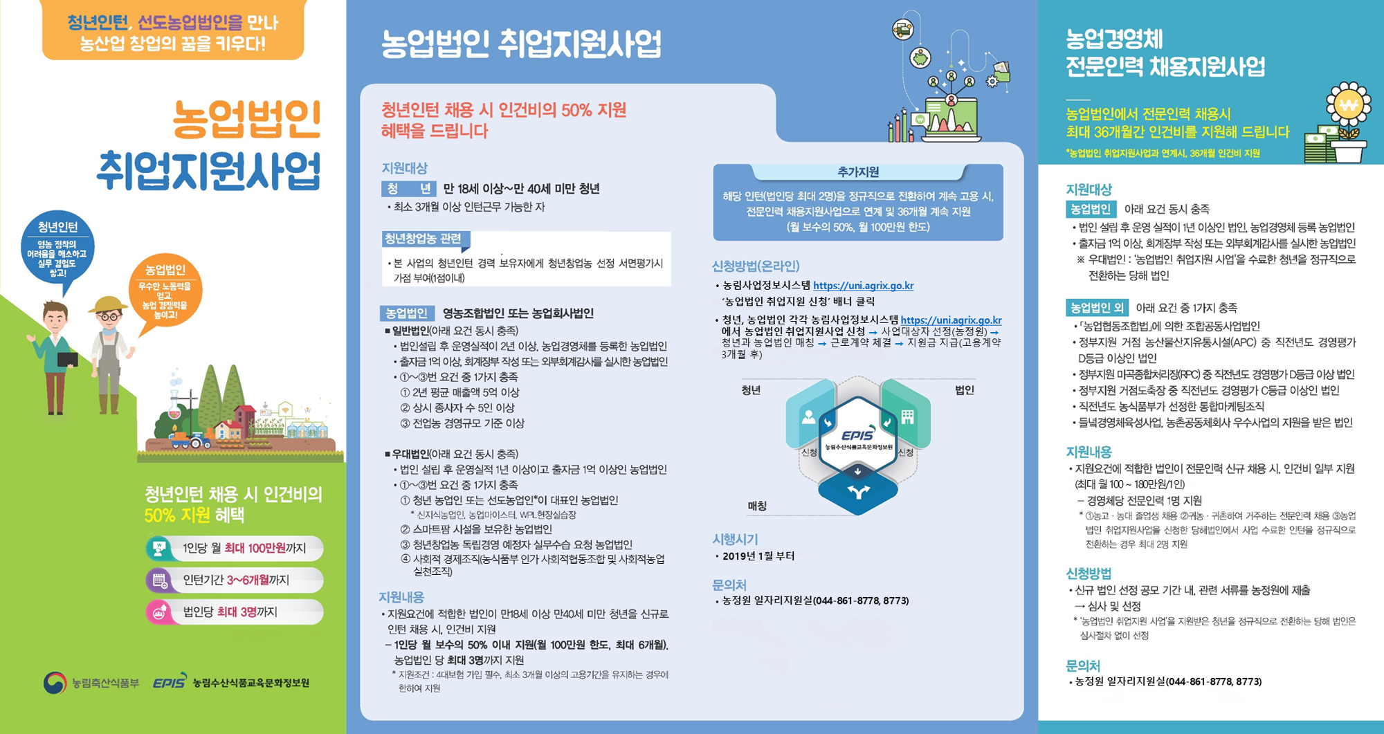 - 지원내용 및 기간 : 농업법인에 인턴 1인당 월 100만원 한도, 월 보수의 50% 이내로