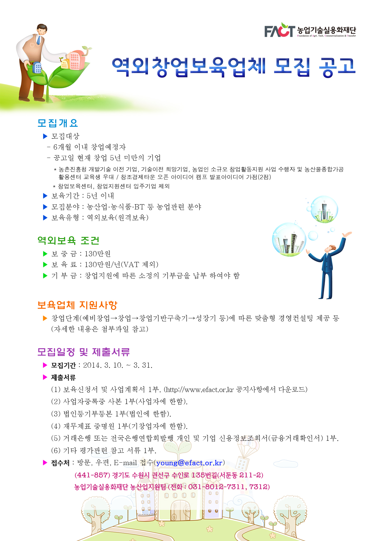 농업기술실용화재단은 농산업․농식품․BT 분야의 예비창업자 및 창업초기기업을 대상으로 기술 및 경영컨설팅 등 체