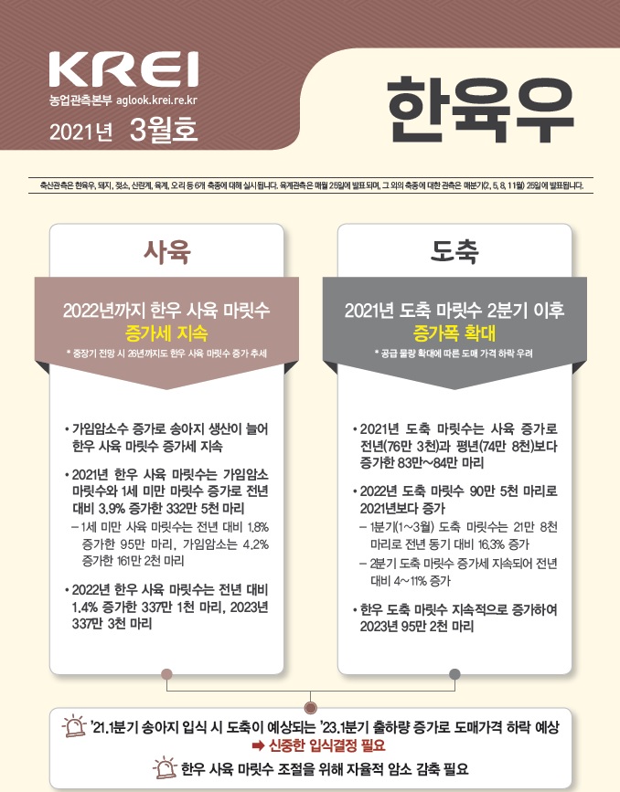 한우 사육농가에서는 첨부된 한우사육 관련 농업관측 자료를 참고하셔서 사육 및 출하 계획을 수립하시기 바랍니다.