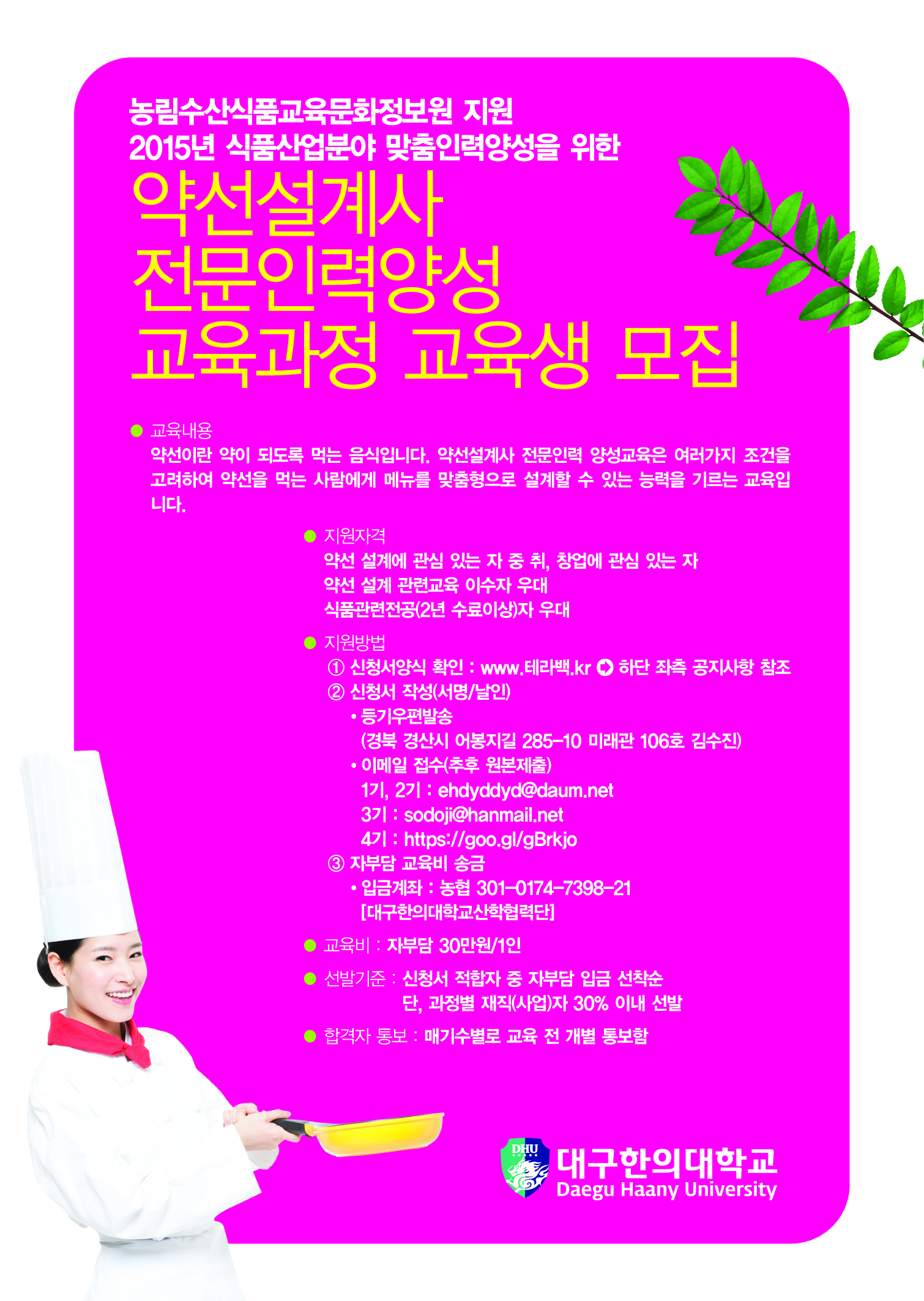 야 전문 직무역량 및 현장맞춤 교육 과정의 운영기관으로 선정되어 「약선설계사 전문인력