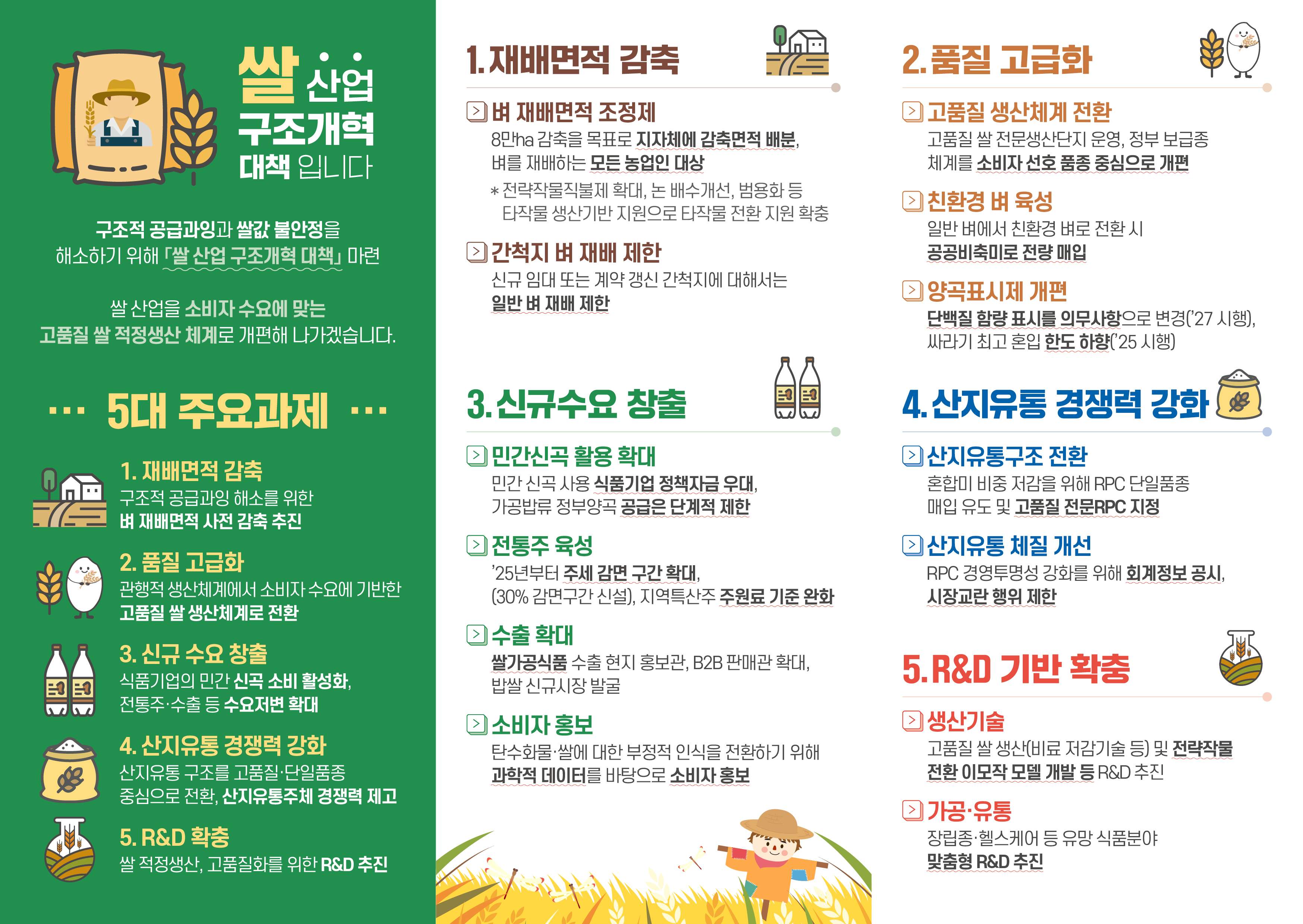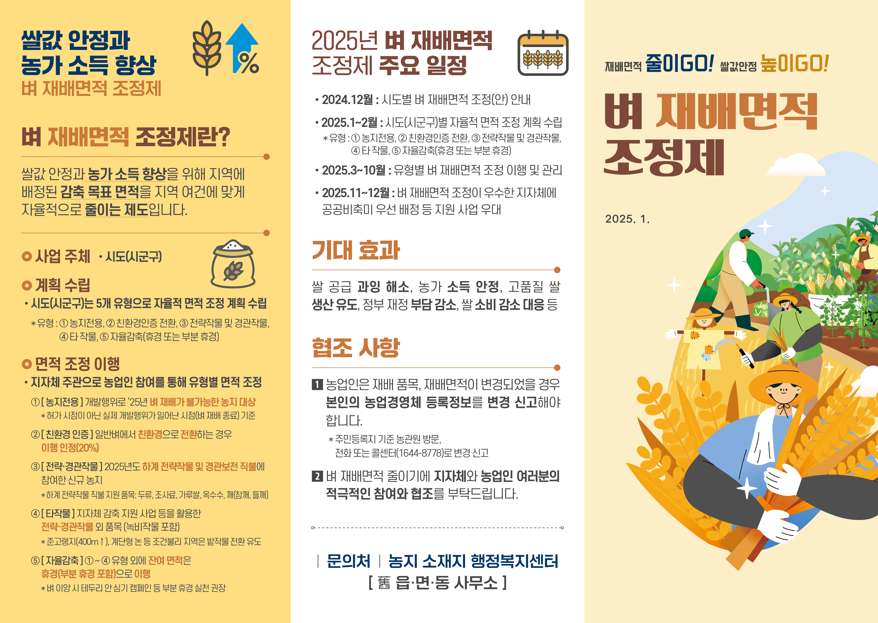 농식품부에서 쌀값 안정과 농가 소득 향상을 위해 추진하는 「벼 재배면적 조정제」 안내입니다.