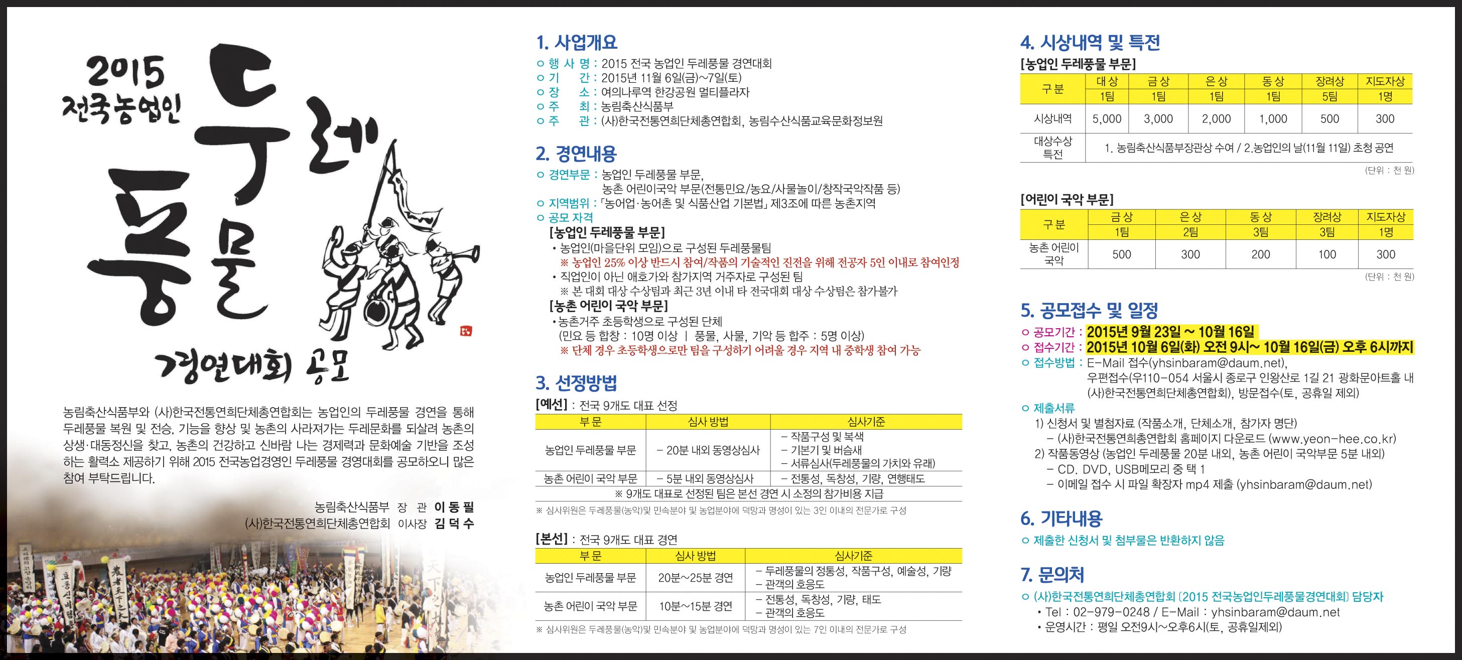 | 423 | 제9회 농업인 두레풍물 경연대회 모집공고 | 농촌개발과 | 2015.10.08 | ![]() ![]() ![]() | 2497 |
