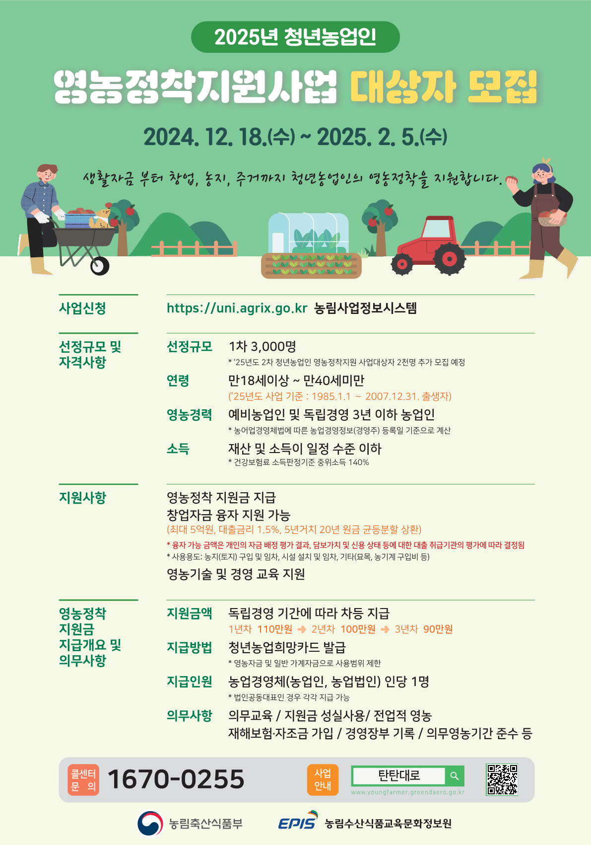 | 1162 | 2025년 청년농업인 영농정착지원사업 신청 안내 | 이상학 | 2024.12.23 | ![]() ![]() ![]() | 1571 |