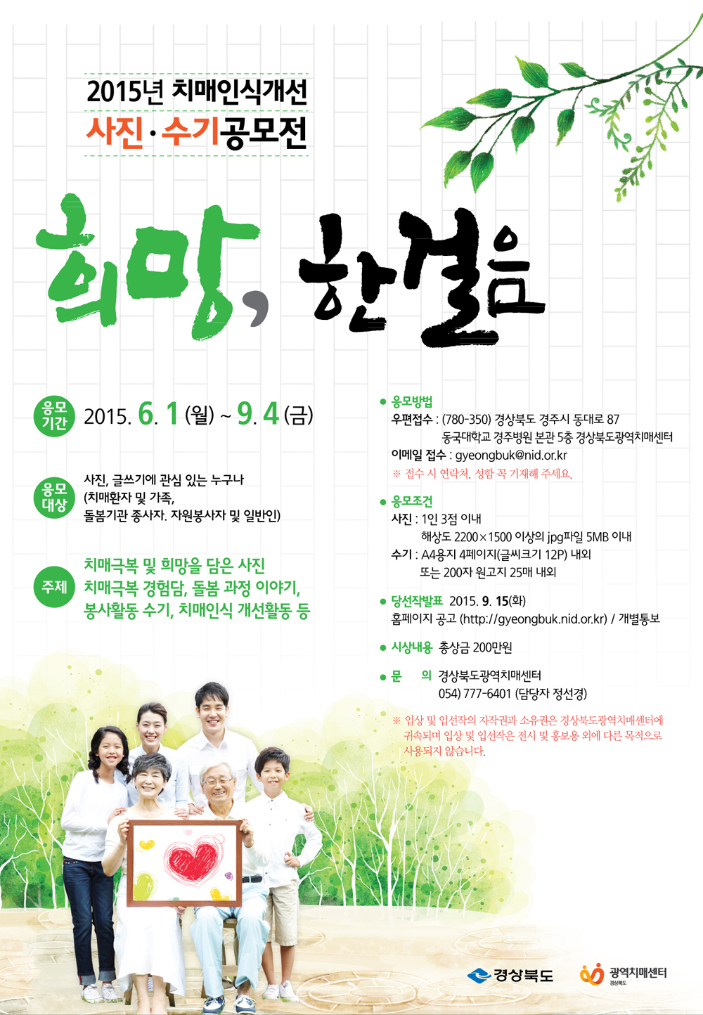 "2015년 치매인식개선 사진.수기 공모전"을 다음과 같이 개최하오니 지역주민의 많은 참여를 부탁드립니다.