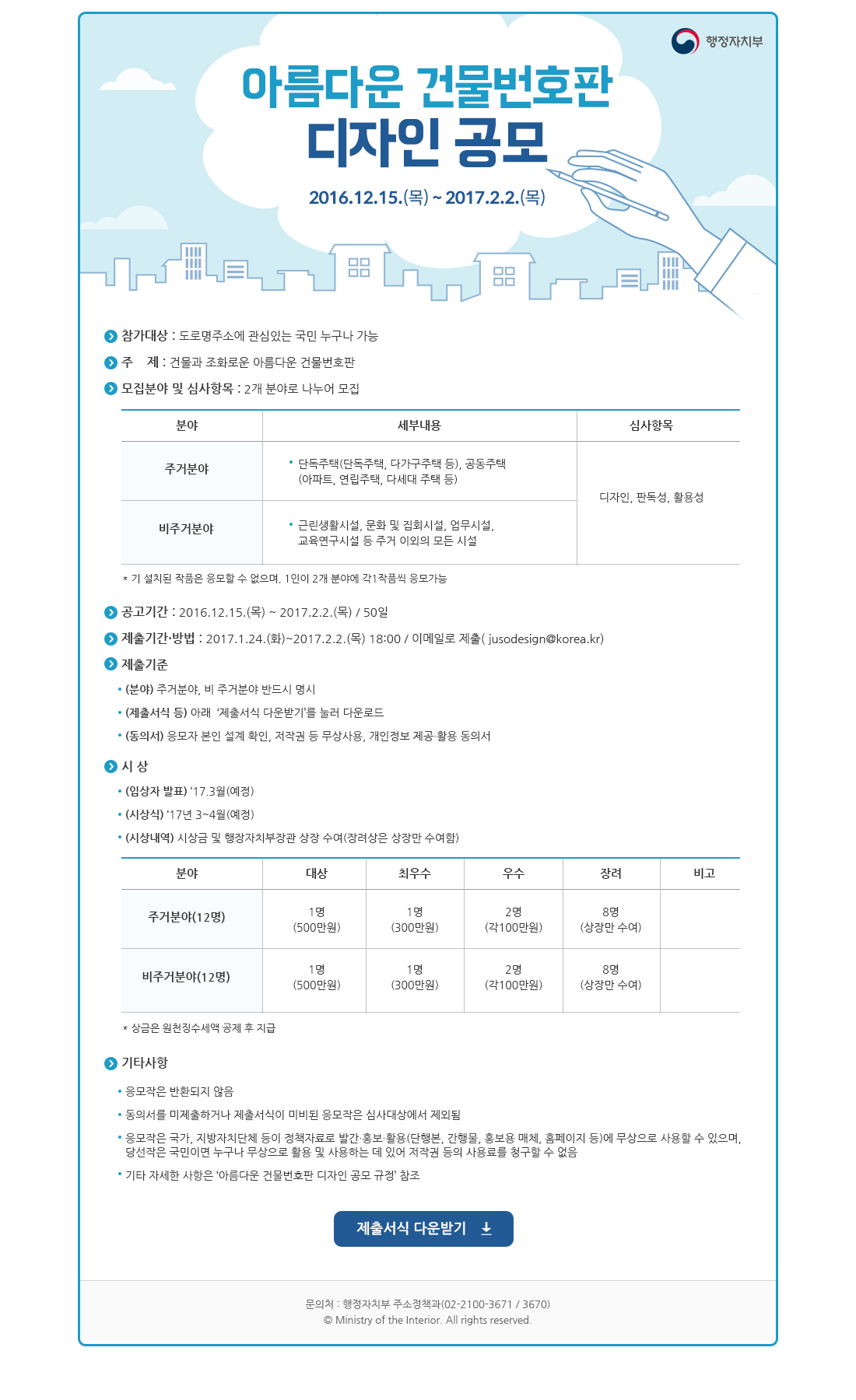도로명주소 홍보 및 공모 참여유도를 위해 행정자치부에서는 「아름다운 건물번호판 디자인 공모」를 실시하고 있습니다