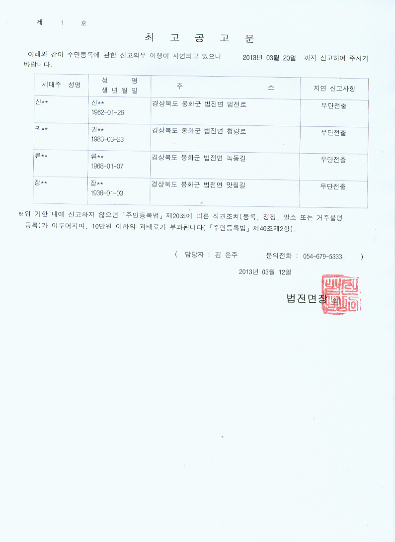 2013년 주민등록 일제정리 최고 공고문을 다음과 같이 공고합니다.