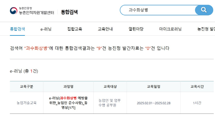 접속경로 : 농촌인적자원개발센터 → e-러닝 → 농업기술교육 → 과수화상병 예방을 위한 농업인 준수사항