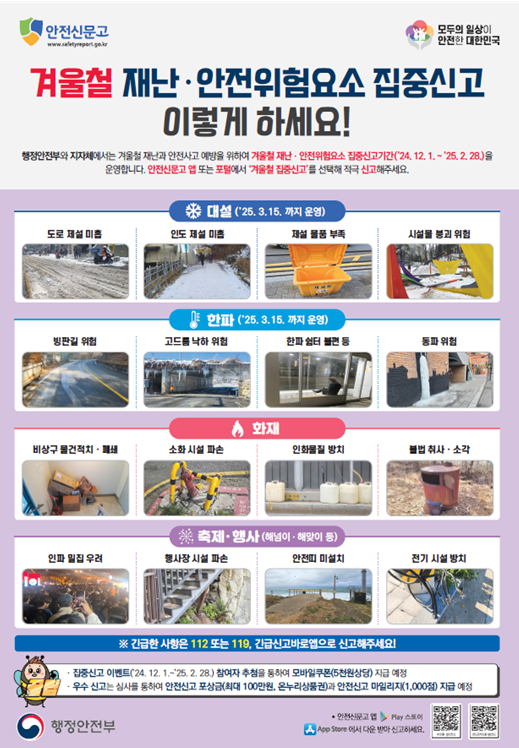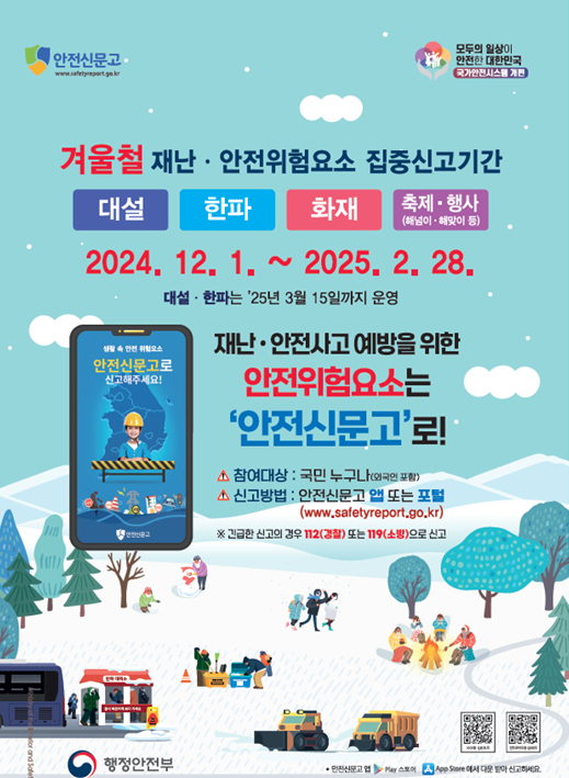 | 1232 | 2024년 겨울철 재난, 안전 집중 신고제 안내 | 송대익 | 2024.12.02 | ![]() ![]() | 119 |