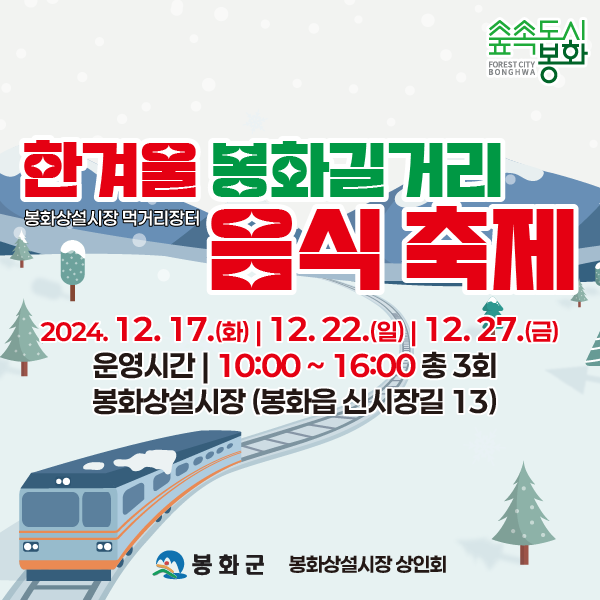 | 1238 | 2024년 봉화 상설시장 먹거리장터 운영안내 | 송대익 | 2024.12.09 | ![]() ![]() ![]() ![]() ![]() | 120 |