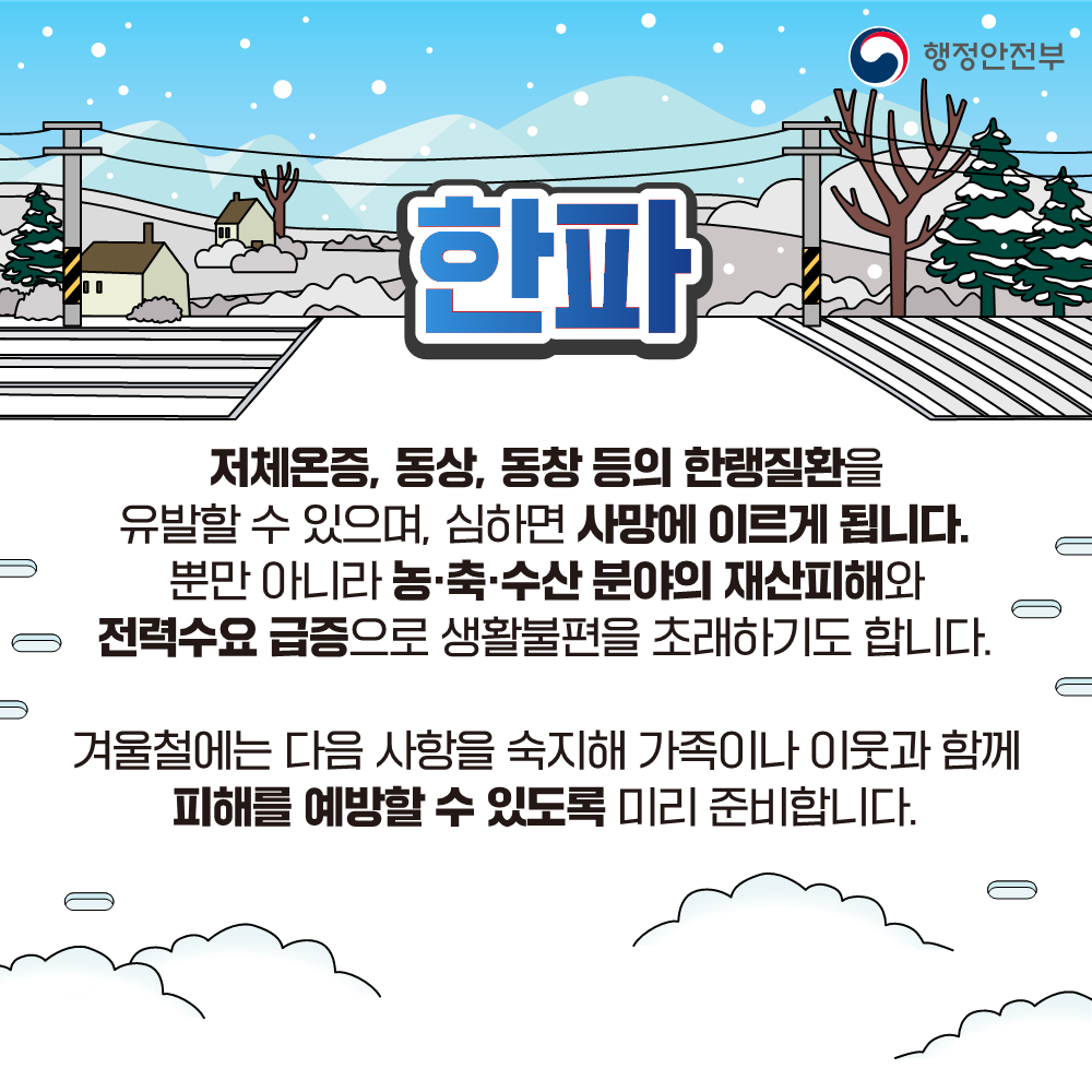 | 1228 | 겨울철 자연재난(한파) 대비 국민행동 요령 안내 | 송대익 | 2024.11.27 | ![]() ![]() ![]() ![]() ![]() ![]() ![]() ![]() ![]() ![]() | 130 |